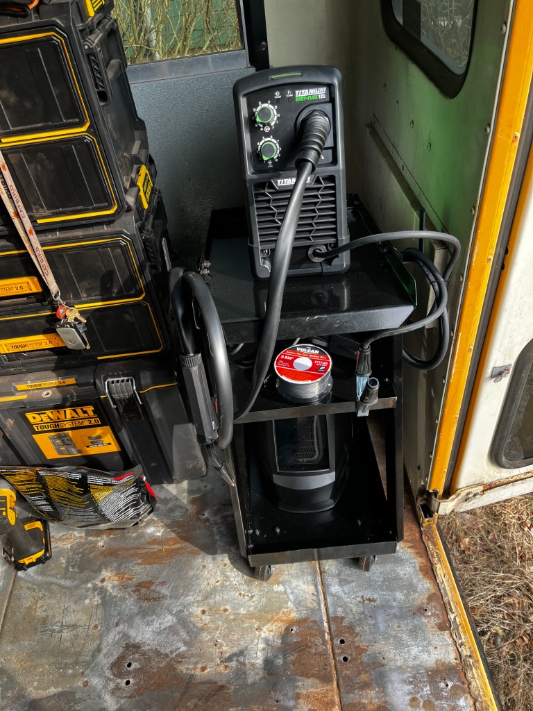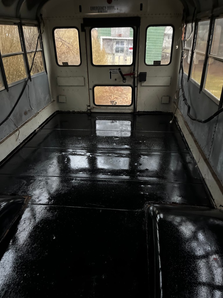 It was a busy weekend!, I went to Harbor Freight and picked up a flux core welding setup, some 16 gauge steel, and my Chassis Saver finally arrived. Not knowing much about welding I did some practice welds, I am not ashamed to admit I hate it with a passion. Anyways, Once I get better at it I’ll get the holes patched up, but I need to get better at welding first before I try welding onto the bus itself. I did more rust removal and a lot of shop vac and sweeping. Then I moved all my tools form the back of the bus and put down the Chassis Saver to see how it would cover, it was worth the $120 a gallon, I credit Chuck Cassidy for that tip, and for the way I will be doing the floors as I get to that part of the build. I may drop a link here to one of his videos here and there so you can see how I am planning to do my floors.