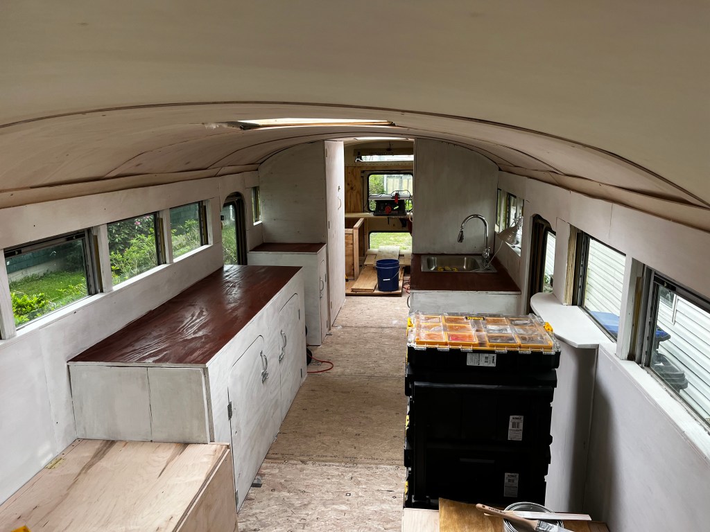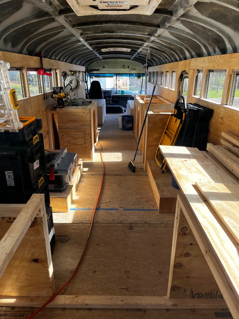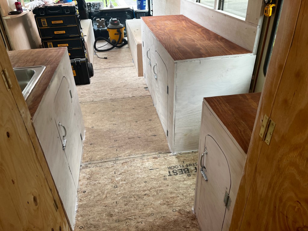 Ive been reallly bad about updating this blog, however I have made some progress. I installed the flooring and trim o the bus, it’s coming together nicely. A lot of what’s left is really expensive so Im trying to save up for things like tires and tanks and plumbing and wiring materials