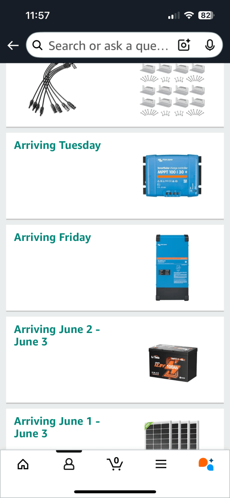 I had purchased a lot of equipment for the power system. I bought a Victron Multiplus II Inverter/Charger, Victron Solar Charger, 4 solar panels and a Lithium Battery. I need ALOT more components to get this all wired up.