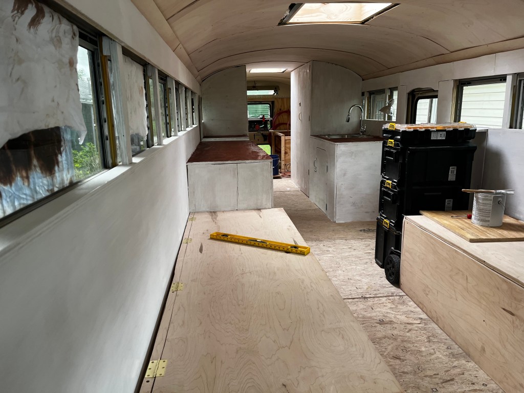 Since I have to wait on hard to get components for the electrical, I cut up boards to make my bed frame. Ive been holding off until I was confident I didnt need to put anymore large sheets of plywood into the bus..I think im there.
